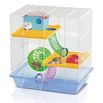 Cusca din plastic si metal pentru rozatoare. Dimensiunile: 44x26x53.5. Distanta dintre gratii: 10.2 mm Accesorii incluse: roata, casuta, tunel, hranitor, clame de prindere