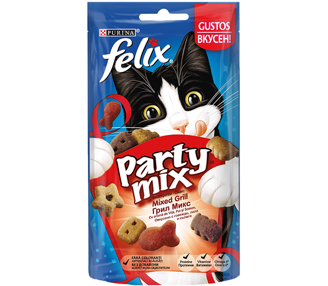 Felix Party Mix Mixed Grill INGREDIENTE Carne si produse derivate de natura animala (din care 10% pui si 0,5% vita), cereale, uleiuri si grasimi, extracte de proteine vegetale, substante minerale, zaharuri, drojdii, peste si produse derivate din peste…