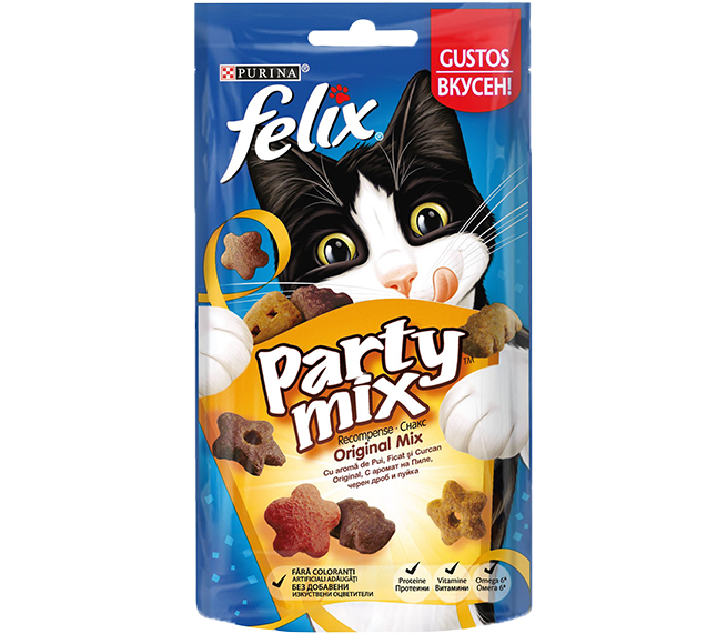 Felix Party Mix Original Mix INGREDIENTE Carne si produse derivate de natura animala (din care 10% pui, 2% ficat si 0,5% curcan), cereale, uleiuri si grasimi, extracte de proteine vegetale, substante minerale, zaharuri, drojdii, peste si produse…