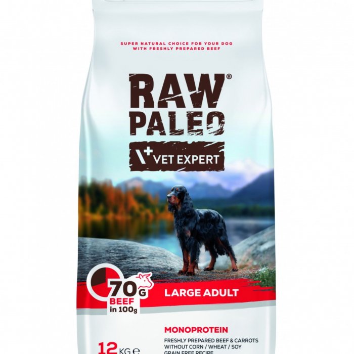 Raw Paleo Large Adult , cu vita Raw Paleo Large Adult este o hrana completa si echilibrata, dedicata cainilor adulti de talie mare (cu greutate corporala peste 25kg). Formula este fara cereale, mono-proteica- sursa unica de proteine de origine animala-…
