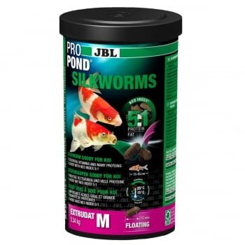 JBL ProPond Silkworms M 0.34 kg, hrana cu viermi de matase pentru pestii de iazuri.Peleti plutitori in forma de viermi de matase pentru toate sezoanele. Raport proteine/grasimi 5:1, in conformitate cu indicele NEO INDEX
