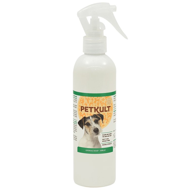 PETKULT ANIMAL SOAP-SPRAY 250ml este un spray pentru curatare uscata, care elimina eficient murdaria de pe blana animalelor, fara a fi necesara clatirea. Produsul este recomandat in special pentru curatarea rapida a labutelor, a burtii si a botului cainelui, dupa fiecare plimbare. Glicerina din Petkult Animal Soap-Spray mentine pielea hidratata, iar extractul de galbenele protejeaza impotriva iritatiilor. Extractul de galbenele are efect antiinflamator, cicatrizant si stimuleaza sinteza colagenului in piele.