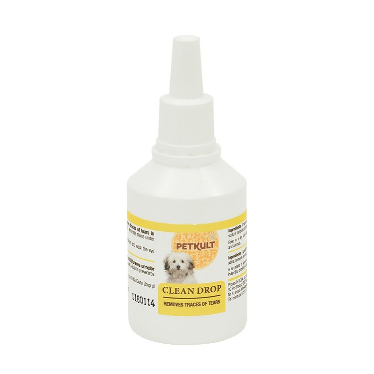 PETKULT CLEAN DROPS 40ml este o solutie profesionala pentru inlaturarea urmelor de lacrimi la caini si pisici. Cainii de talie mica si cei cu blana alba sunt mai predispusi la lacrimarea excesiva. Lacrimile in exces mentin umeda blanita de la nivelul ochilor, asigurand astfel bacteriilor un mediu propice pentru dezvoltare. Odata cu aparitia bacteriilor, zona capata o coloratie maronie caracteristica, neatractiva. Folosit in mod regulat, Petkult Clean Drops ajuta la prevenirea formarii petelor de sub ochi.