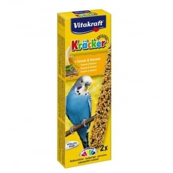 Baton Perusi Vitakraft Susan/Banane 2 Buc – Batoane sanatoase si delicioase pentru perusi, cu un gust delicat de banane si susan, placut de aceste pasari.Gustoase, sunt preparate din cereale coapte de 3 ori ce invelesc o bagheta din lemn natural