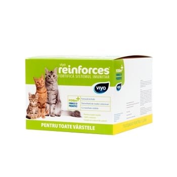 Viyo Reinforces for Cats All Ages, 30 x 30 ml este un supliment nutritiv pentru pisici de toate varstele sub forma de bautura sanatoasa, prebiotica, cu nutrienti activi care se absorb rapid in tractul intestinal